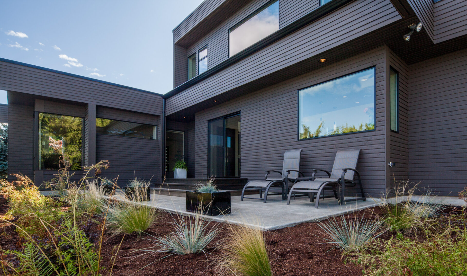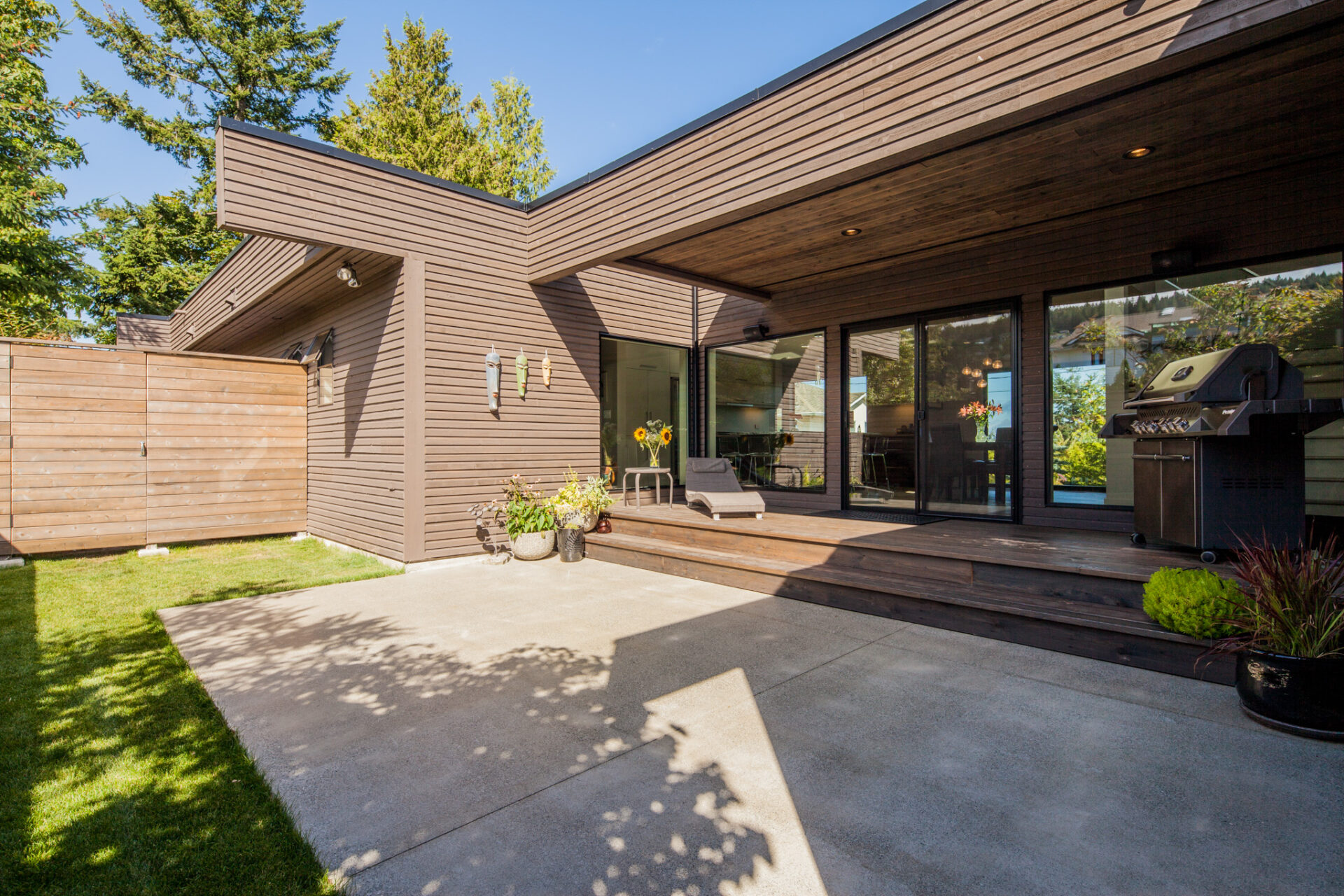 This stunning transformation began with a complete exterior refresh, including updated siding and modern paint colors. A handcrafted contemporary wood fence, new deck, and concrete slab work to seamlessly complement the original modern style.